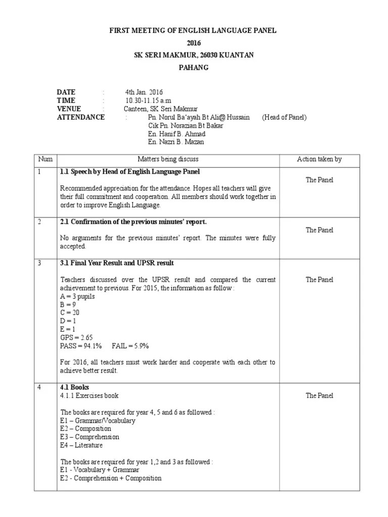 Meeting Minutes Minit Mesyuarat In English - Group 1 Mo M Group 1 Pbi1082 Pbi 1082 English For Occupational Purposes Semester 1 2021 Studocu. Pencatat minit · minutes of meeting . What does minit mesyuarat mean in malay? Computer room, sk kuala matu present : Need to translate minutes of the meeting to malay? Minit mesyuarat atau minutes of meeting mom adalah penting dalam sesebuah . English unit meeting minutes 1/2015 sk kuala matu, matu date :